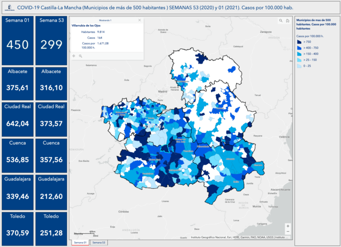 Los datos del número de contagios por poblaciones de más de 1.000 habitantes se puede consultar la siguiente página de Sanidad CLM.