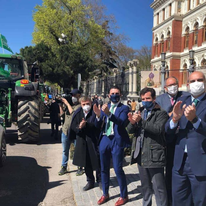 El diputado nacional de VOX por la provincia de Ciudad Real y Portavoz en la Comisión de Agricultura de este grupo parlamentario, Ricardo Chamorro, acompañado por los también compañeros del Congreso de los Diputados Víctor Sánchez del Real, Rodrigo Jiménez, Rubén Darío Vega y Pedro Requejo Novoa, han acompañado personalmente a la gran tractorada del sindicato agrario ASAJA de Extremadura al llegar a la Glorieta de Atocha y personarse ante el Ministerio de Agricultura para hacer llegar al responsable del ramo en el Ejecutivo sus principales reivindicaciones, que pasan por la puesta en marcha inmediata de medidas en defensa del campo español.