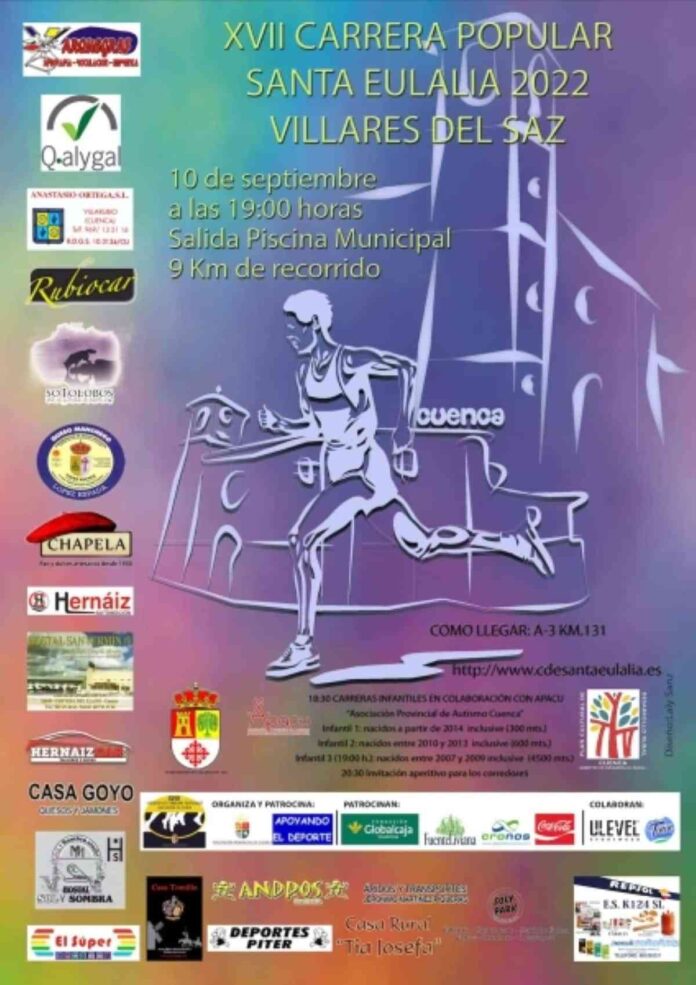 El 10 de septiembre se celebrará la XVII Carrera Popular Santa Eulalia 2022 Villares del Saz. Será a las 19 horas con salida en la piscina municipal de la localidad. Esta carrera tendrá un recorrido de 9 kms.