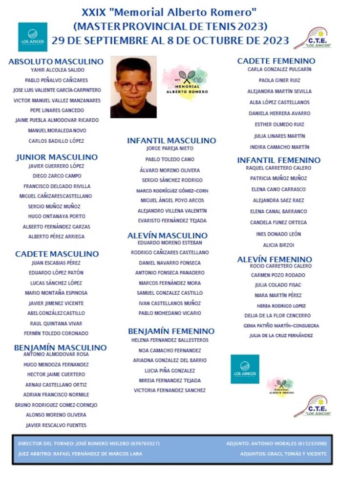 El Memorial «Alberto Romero» es la cita perfecta para los amantes del tenis que tendrán oportunidad de disfrutar un espectáculo deportivo de primer nivel provincial en las impresionantes instalaciones de Los Juncos. Este torneo reúne a los ocho mejores jugadores y jugadoras de todas las categorías, desde alevín hasta absoluto, para competir en partidos que seguramente mantendrán a los aficionados al borde de sus asientos.