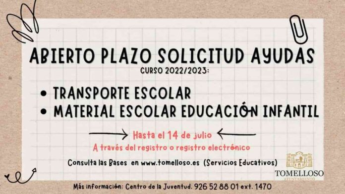 Las ayudas para material y transporte escolar ya pueden solicitarse, porque el plazo está abierto hasta el próximo 14 de julio. Estas ayudas son convocadas por el ayuntamiento de Tomelloso (Ciudad Real) para el curso 2022-2023. Según han informado, las bases completas de las convocatorias se pueden consultar en los servicios educativos de la web municipal o en la concejalía de Educación en calle Soria esquina La Paz.