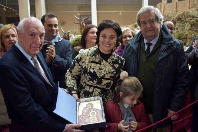 En señal de agradecimiento, la alcaldesa les entregaba a los maestros belenistas Antonio Vich y Lázaro Torres, un icono de la Virgen María con el Niño en reconocimiento a su labor, y otro a Guerreros Púrpura.